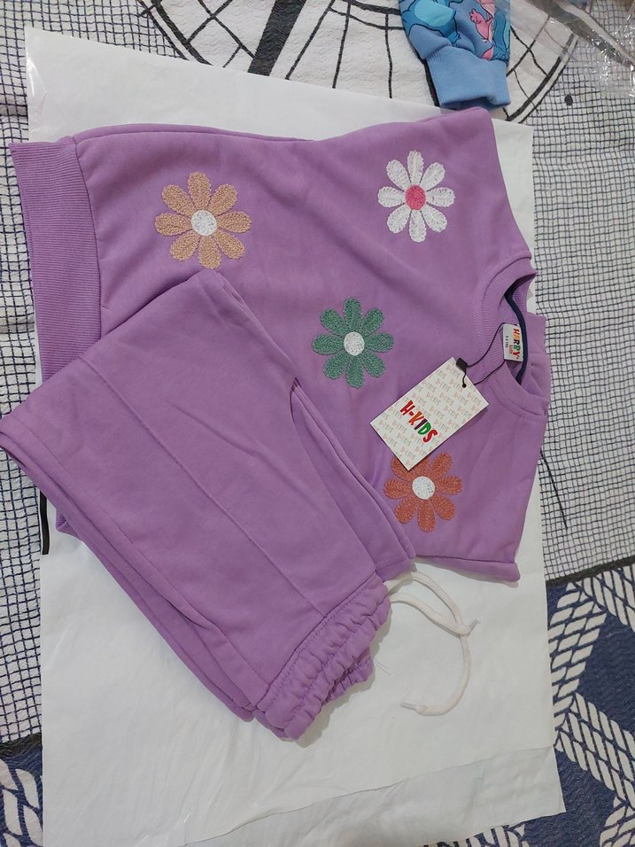 Lila renkli, bol kesim sweatshirt ve eşofman altı, yuvarlak yaka, uzun kollu, renkli çiçek baskıları ve dantel detaylarına sahiptir. Yumuşak ve sıcak kumaştan üretilmiştir.