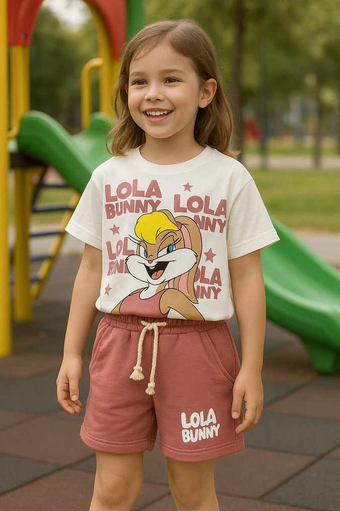 Pamuklu kumaştan yapılmış, bej renkli ve pastel Lola Bunny baskılı, yuvarlak yaka kısa kollu, rahat kesim tişört. 6-9-12-18 -3-4-5 yaş mevcuttur