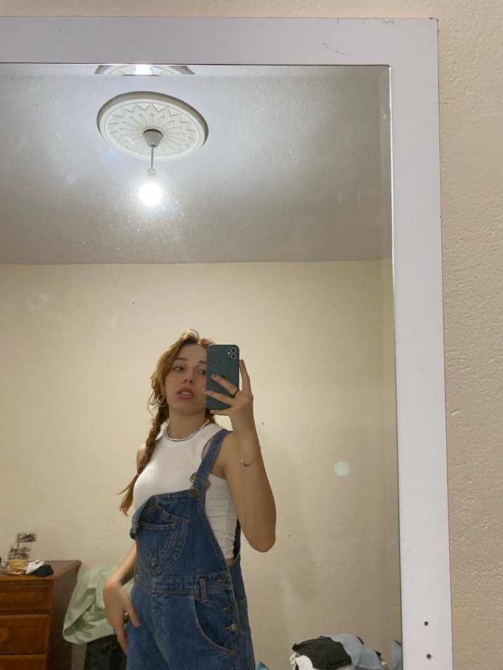 Kızlar için bol kesim, kolsuz kot tulum. Açık mavi batik desenli, rahat ve şık bir counterculture tarz sunar.