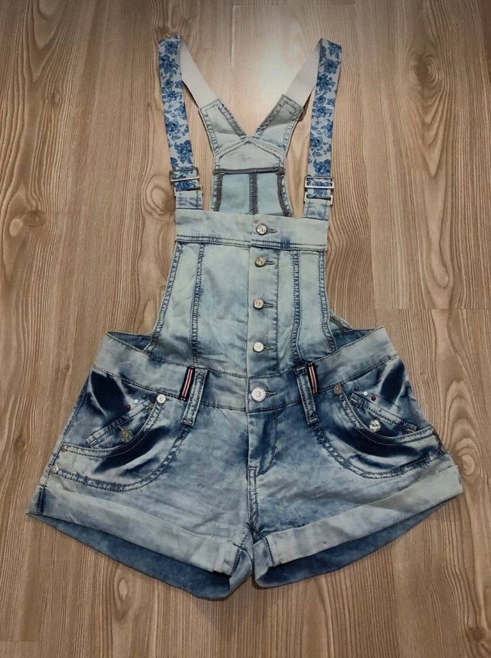 Mavi batik desenli, ayarlanabilir tokalı askıları olan, fitted kesim kot tulum, sokak stili için uygundur.