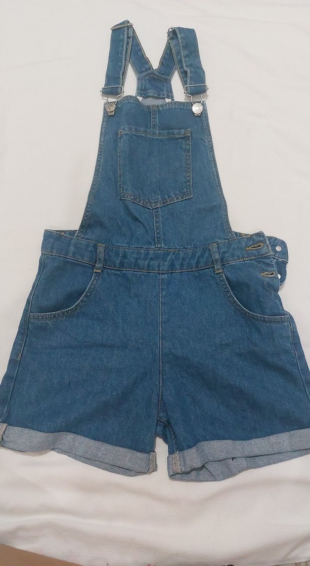 Ayarlanabilir tokalı askıları ve ön cepli, bol kesim mavi kot şort salopet. Sokak tarzı için uygun.