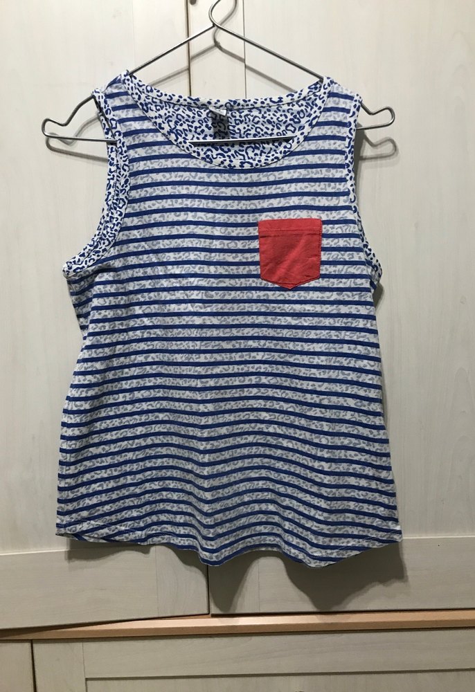 Mavi çizgili, kırmızı düğmeli cep detaylı, bol kesim, kolsuz, yuvarlak yaka kız çocuk tişörtü.