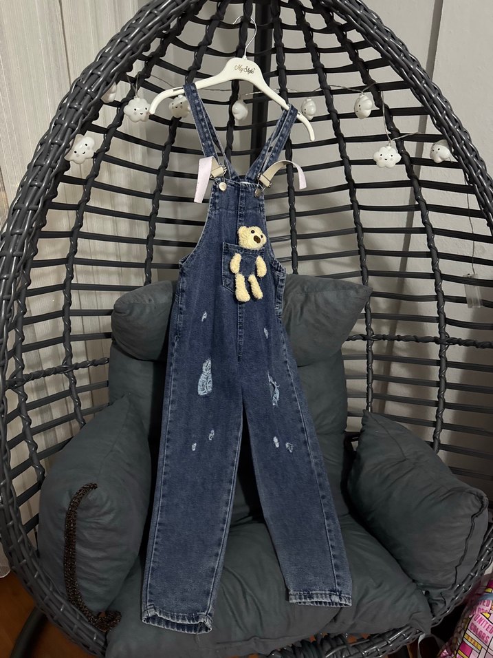 Kızlar için mavi denim, askılı, tokalı ve bol kesim tulum. Bağlama desenli ve sevimli ayıcık aksesuarı içerir.