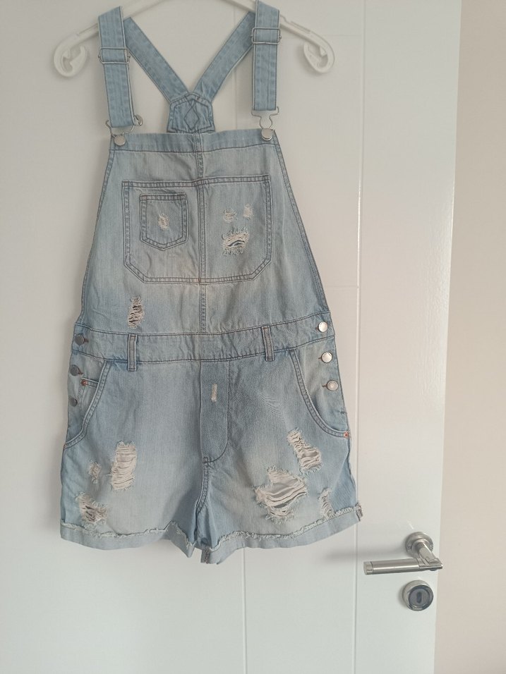 Kızlar için bol kesim mavi denim tulum, askılı ve tokalı detaylara sahip, yıpranmış görünümüyle sokak modasına uygun. United colors of Benetton marka