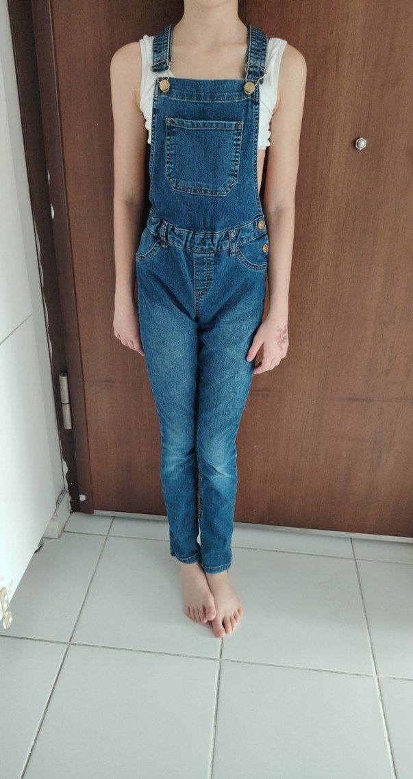 Askılı, fitted mavi denim tulum, sade ve şık bir görünüm sunar. Desensiz yapısıyla kolay kombinlenir. Hiçbir kusuru yok giymedi bile