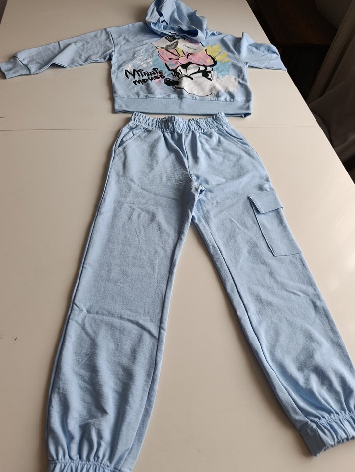 Kızlar için bol kesim mavi denim eşofman takımı, baskılı uzun kollu sweatshirt ve elastik bel pantolon ile rahat ve şık bir görünüm sunar. #fincan #terlik #sporayakkabi #kirtasiye #oyuncak #elbise #pantolon #porselen #antika #vintage