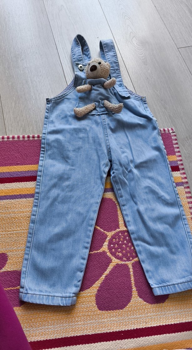 Ayarlanabilir tokalı askılara sahip, önünde oyuncak ayı detayı bulunan bol kesim mavi denim kız tulumu. Rahat streetwear tarzı. sadece tek askısının düğmesi yok