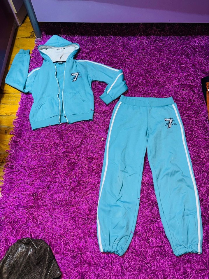 Fermuarlı kapüşonlu üst ve uzun kollu, pastel mavi renkli dar kesim kız eşofman takımı. Yumuşak polar kumaştan, beyaz yan şeritlerle ve lastikli manşetlerle rahat bir sokak stili sunar.