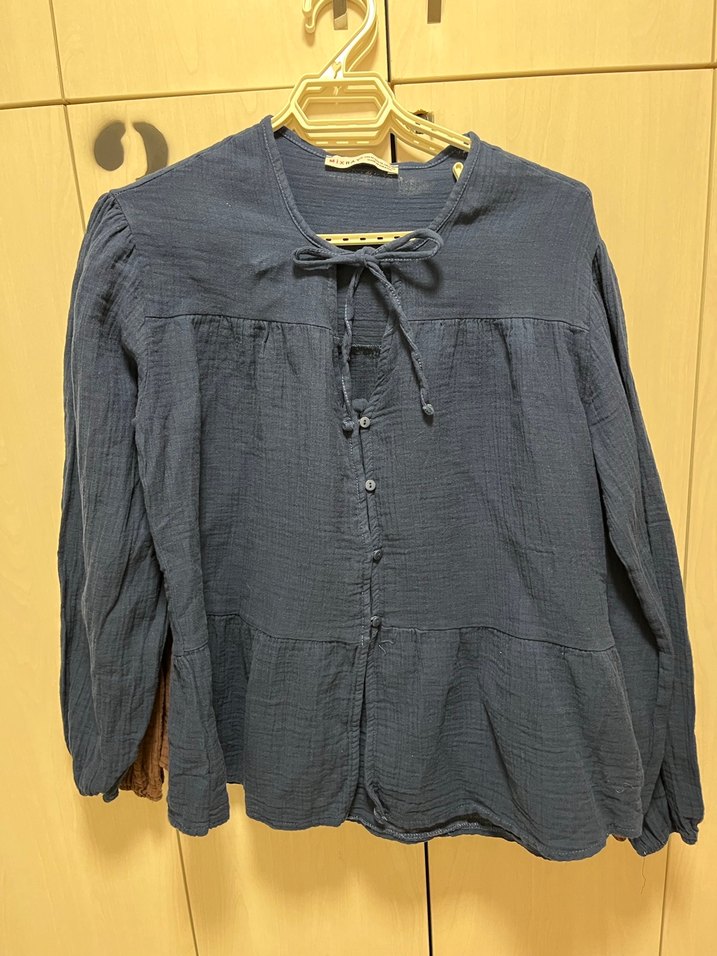 Keten kumaştan üretilmiş, bohem tarzda, uzun kollu ve düğmeli mavi bluz. Salaş kesimi ve yuvarlak yakası ile rahat bir tasarım sunar.