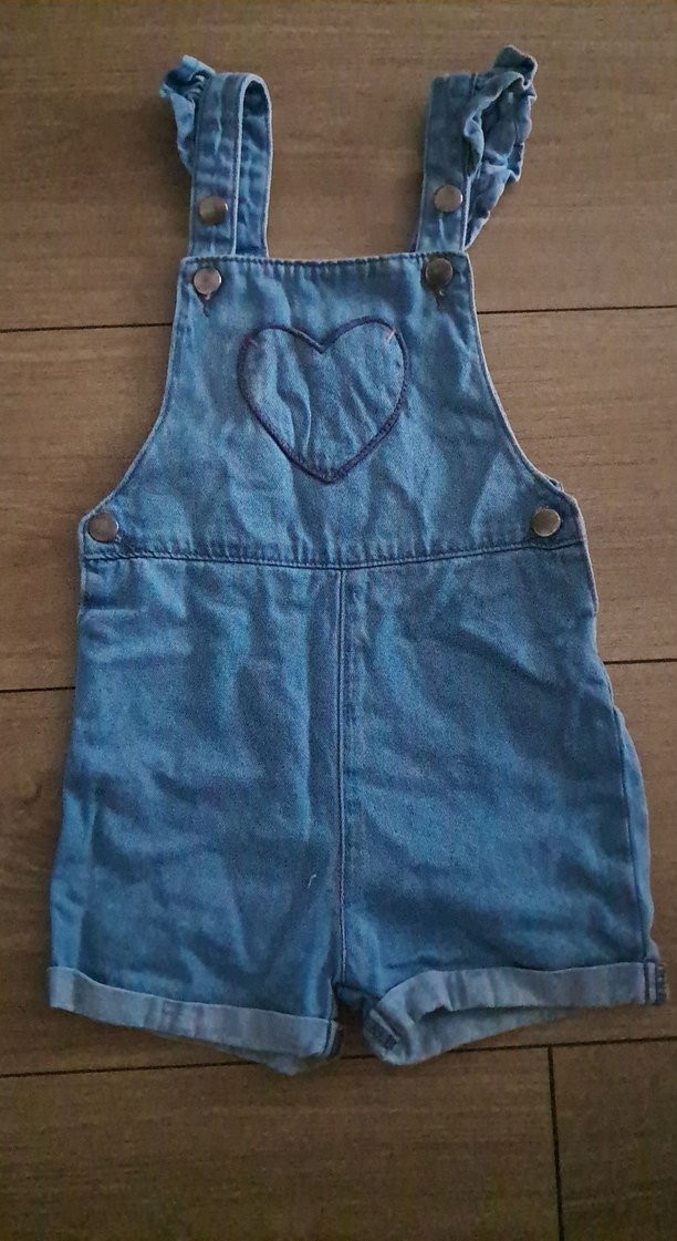 Kızlar için bol kesim, askılı, mavi kot şort tulum. Tokalı askılar ve kalp detayına sahip, rahat ve günlük tarzda.