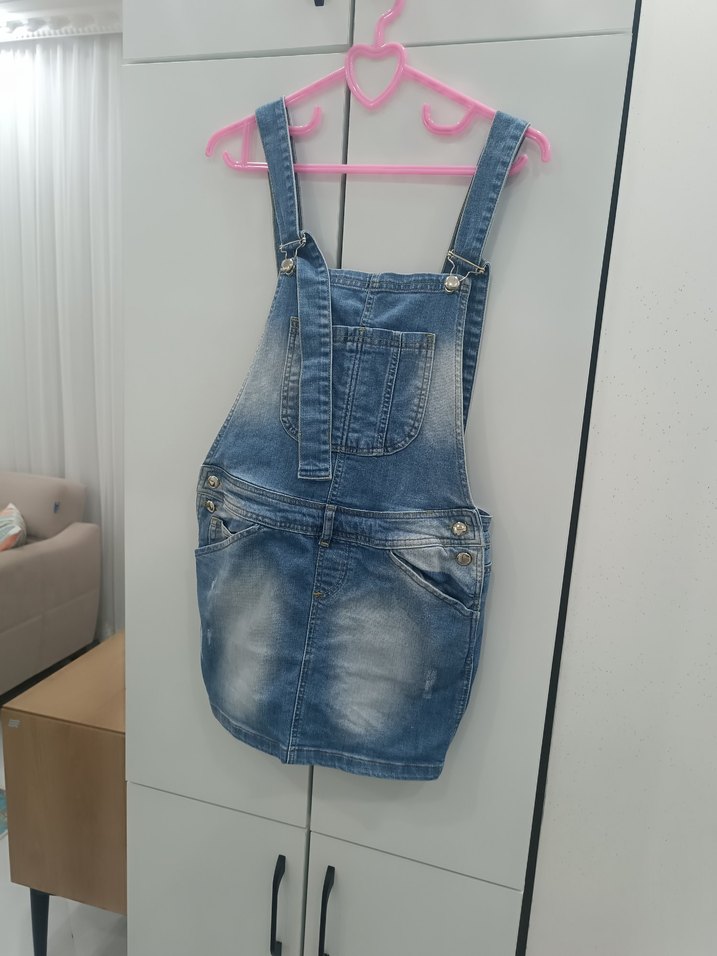 Kızlar için ayarlanabilir tokalı askılı, ön cepli, fitted mavi kot salopet. Desensiz, sokak stili için uygun.