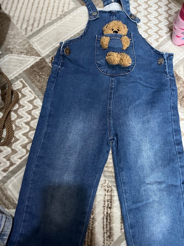 Mavi kot kumaştan, bol kesim, askılı kız salopeti. Cebinde kürklü nakışlı oyuncak ayı detayı bulunur, sokak stiline uygun.