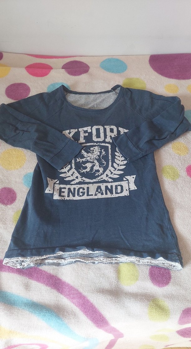 Kızlar için mavi, uzun kollu, yuvarlak yakalı tişört. Baskılı Oxford England deseni ve örme denim kumaşıyla rahat bir görünüm sunar.