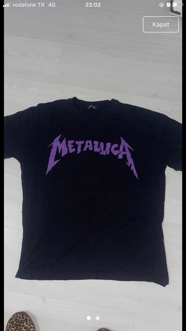 Kızlar için bol kesim, yuvarlak yakalı ve kısa kollu tişört. Siyah zeminde koyu mor metalik Metallica baskısı bulunur, rock punk ve gotik tarzlar için uygun.