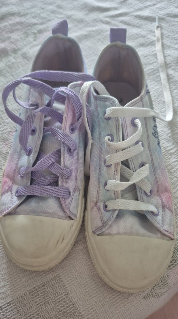 Mor pastel tonlarında batik desenli, bağcıklı ve kauçuk tabanlı kız çocuk spor ayakkabısı.