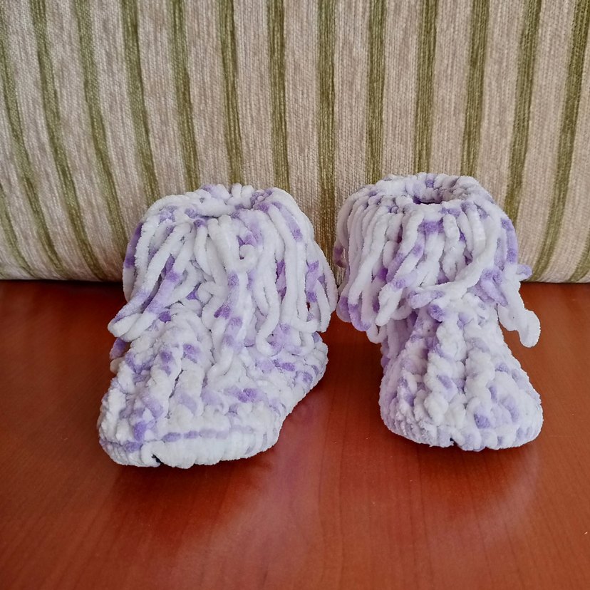Kızlar için örgü, bağlamalı desenli pastel mor renkli, yumuşak ve sıcak ev terlikleri.