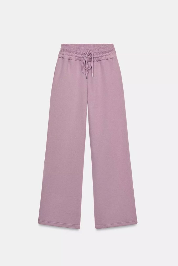 Yumuşak ve sıcak kumaştan yapılmış, pastel mor renkli bol kesim kız pantolonu. Elastik bel ve bağcık ile rahat ve şık tasarım.