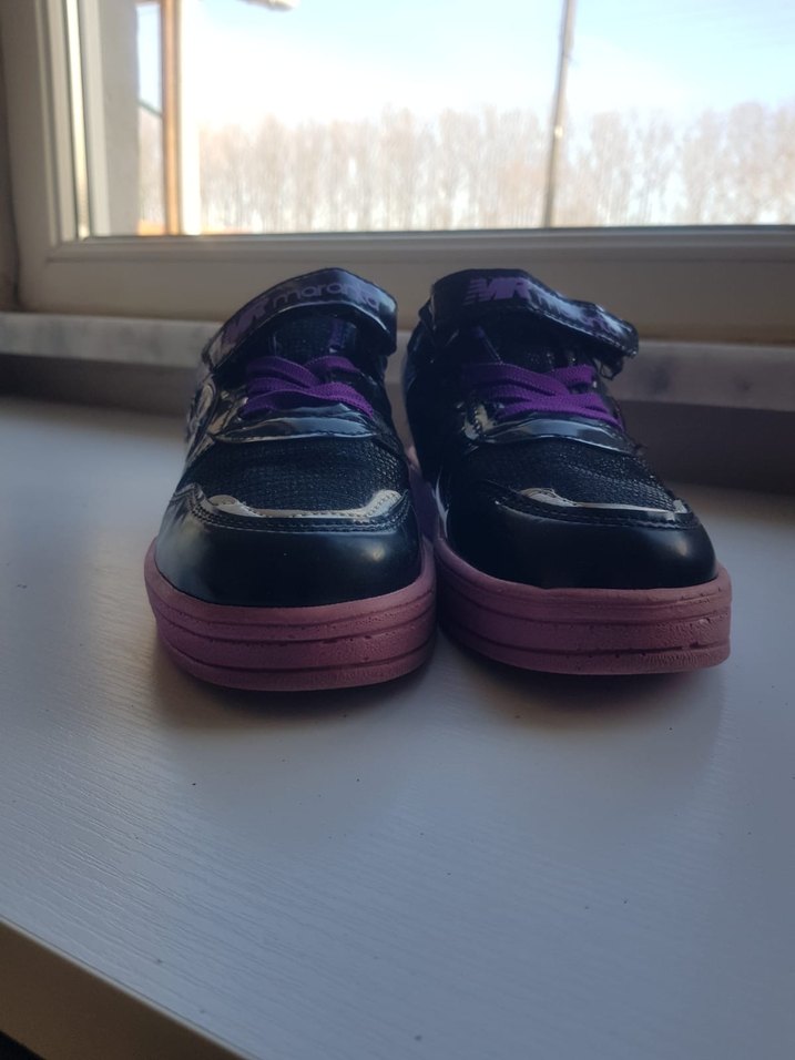Koyu mor renkte, cırtcırtlı bantlı ve kauçuk tabanlı kız çocukları için sneakers. Sokak modasına uygun, desensiz tasarım. Temiz bir iki kez giyildi