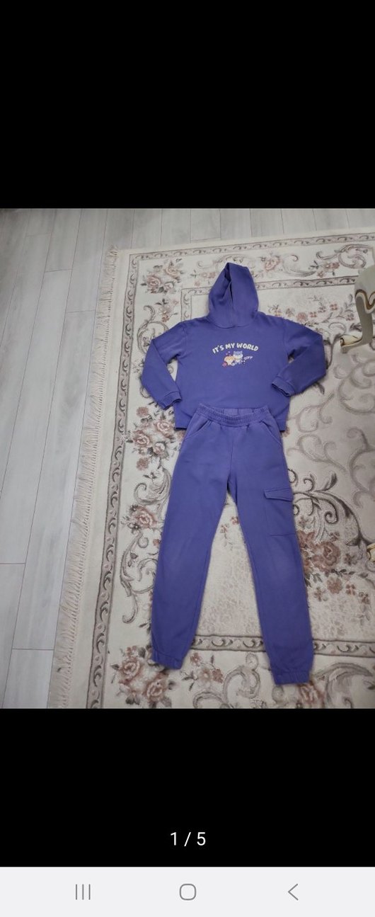 Mor kapüşonlu sweatshirt ve eşofman takımı, bol kesim ve yumuşak kumaşla rahat sokak stiline uygun. Sweatshirt uzun kollu, eşofman paçaları lastikli.