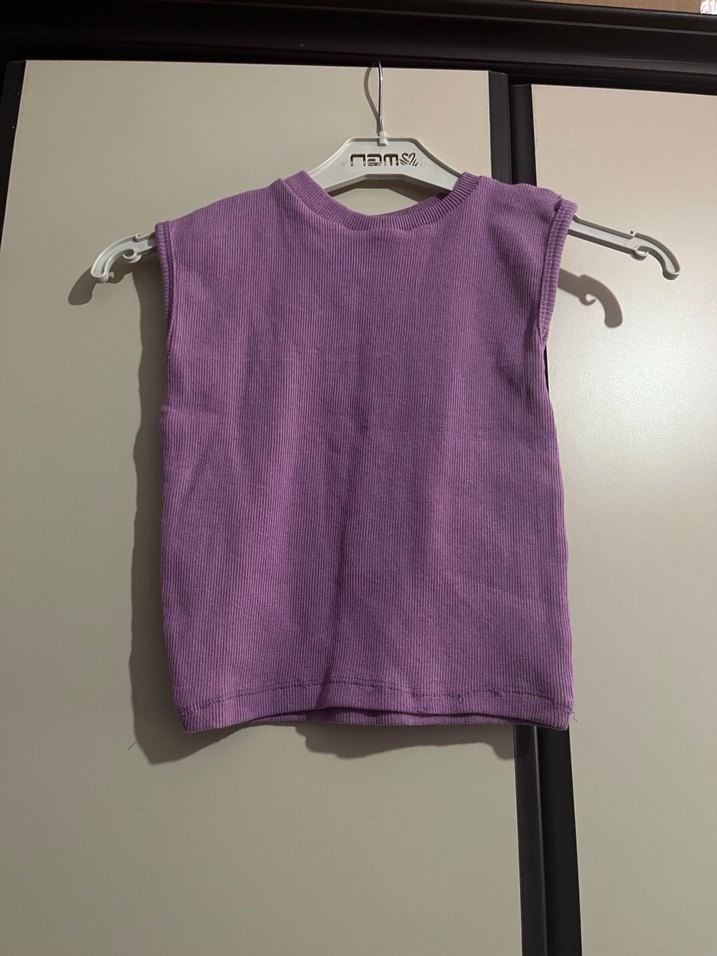 Kızlar için mor renkli, kolsuz, keten kumaştan üretilmiş, yuvarlak yakalı ve bol kesim basic crop/t-shirt. Pastel tonlarda sade tasarımıyla rahat sokak stili sunar.
