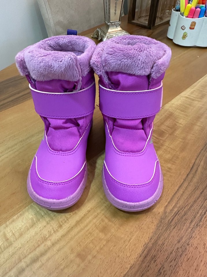 Kızlar için mor renkte, yumuşak ve sıcak kumaşla kaplı, kürklü detaylara sahip sokak stili botlar. Güvenli bant kapanışı ile şık bir görünüm sunar.