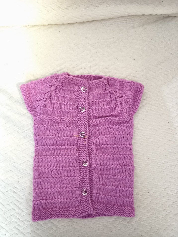 Kızlar için pastel mor renkte, örgü dokulu kolsuz hırka. Düğmeli ve normal kesimlidir.