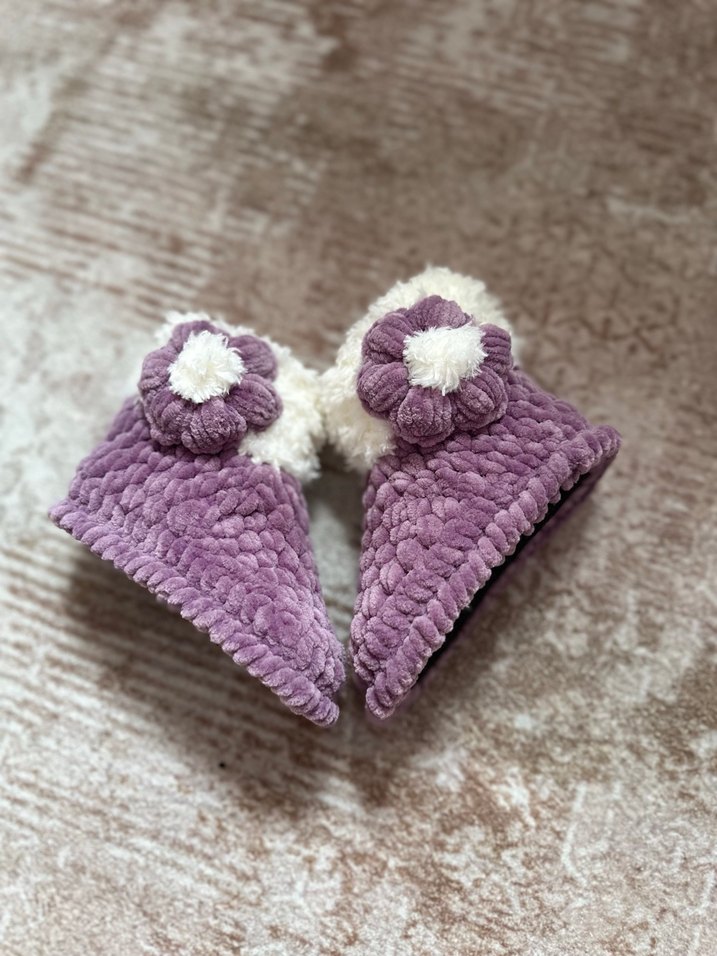 Kızlar için mor örgü sıcak terlikler, nakışlı çiçek detayları ve peluş iç kısmıyla bohem tarzını yansıtır.
