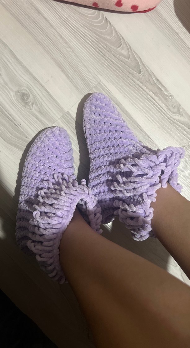 Mor renkli, örgü yapıda kızlar için sıcak ev terlikleri, yumuşak dokusuyla rahatlık sağlar. Pastel tonu bohem ve retro tarzlara uygundur.