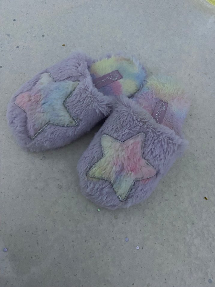 Kızlar için mor peluş, bağlama desenli, kürk detaylı, yıldız süslemeli sıcak terlikler. Bohem ve retro pop kültür tarzı.
