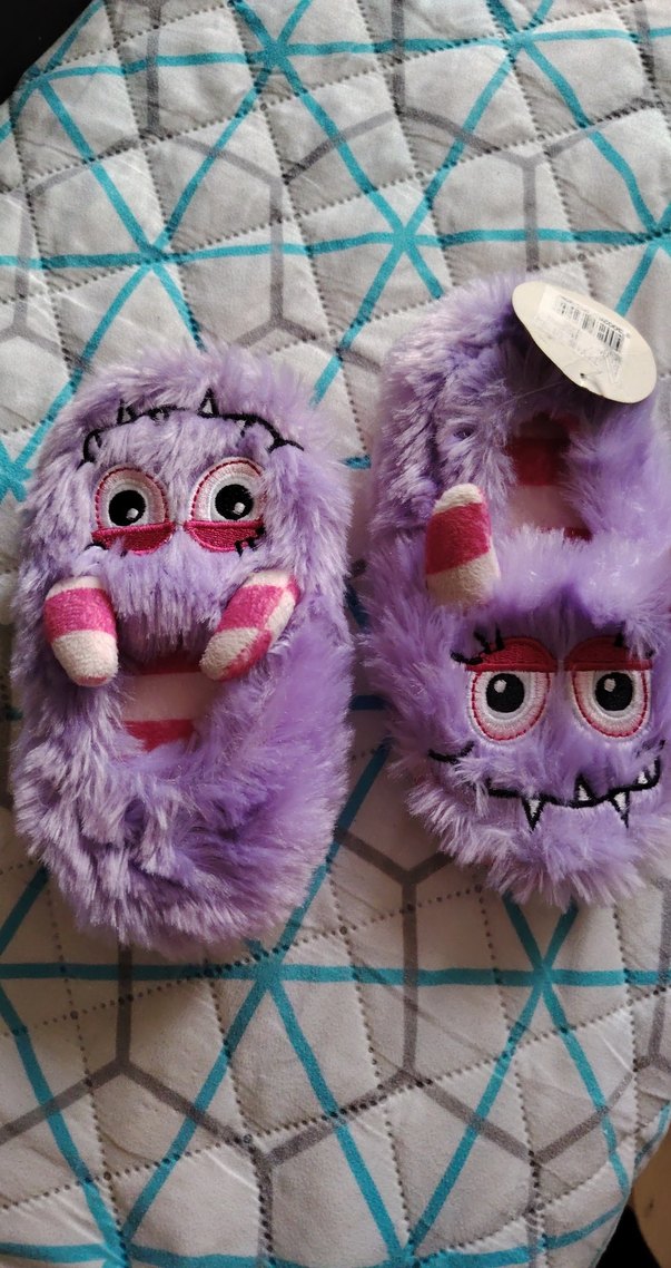 Kızlar için mor peluş terlikler, renkli nakışlı canavar yüzleri ve kürk detaylarıyla bohem ve retro tarzda.
