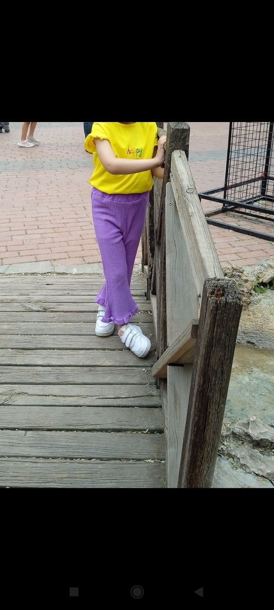 Kızlar için mor renkli, pilili etek ucu detaylı, yumuşak triko kumaştan yapılmış salaş tayt. Rahat ve şık sokak stili için uygundur.