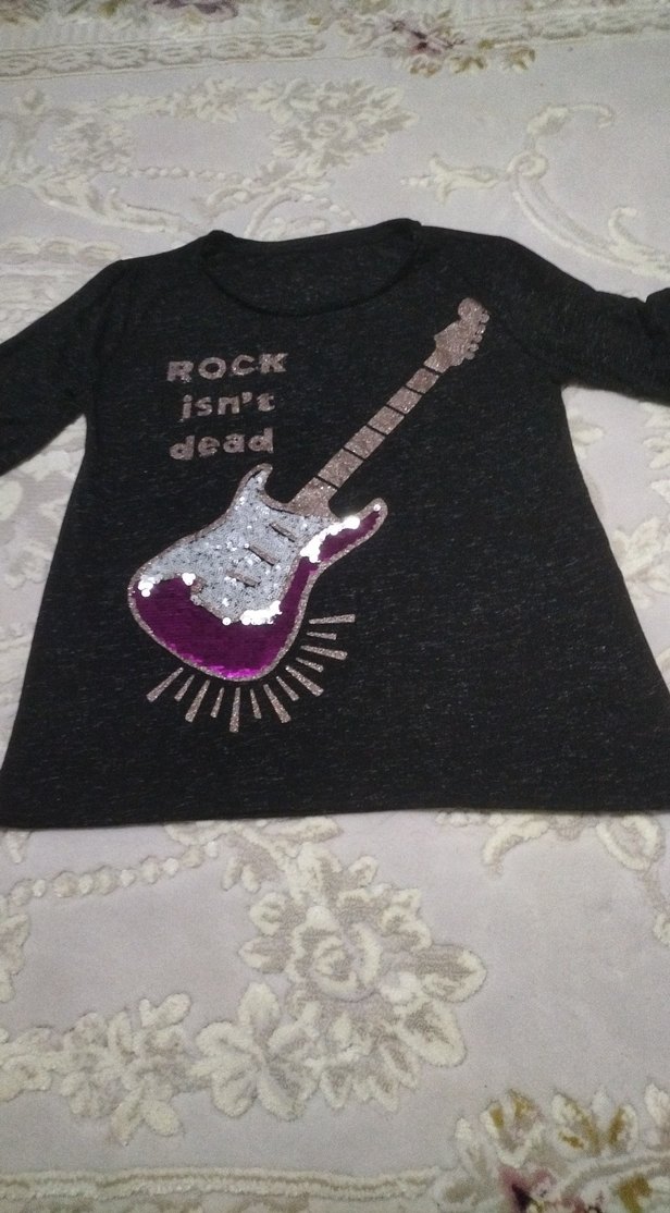 Koyu mor renkte, uzun kollu, yuvarlak yakalı, bol kesim kız tişörtü. Üzerinde payetlerle süslenmiş gitar ve "ROCK isn't dead" yazısı bulunur.