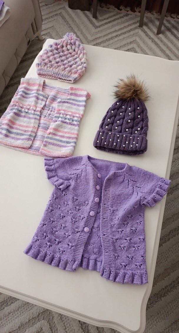 2 takım çok az kullanılmıştır..şapkalar sayılır kullanıldı..4-5 yasa olur Mor renkli, örme kumaştan yapılmış kız çocuk hırkasıdır. Salaş kesimi ve kolsuz tasarımıyla rahat ve gündelik bir görünüm sunar. Pastel tonlardadır. #hırka #yelek #kazak #şapka