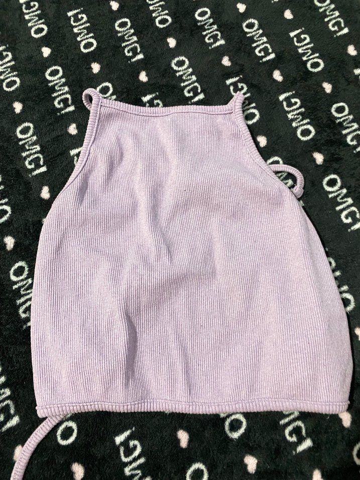 Kızlar için fitted kesim, mor pastel renkte triko kumaştan yapılmış kolsuz sırt dekolteli bluz