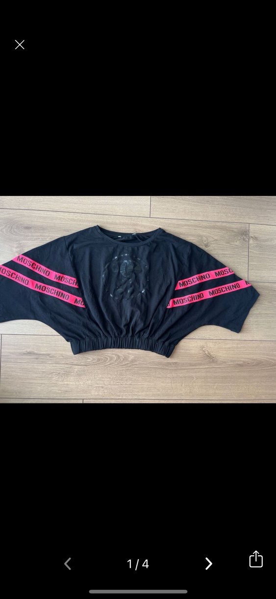 Kızlar için uzun kollu, bisiklet yaka ve bol kesim siyah bolero. Pembe Moschino yazılı bantlar ve kemer detayı ile rock punk tarzı sunar.