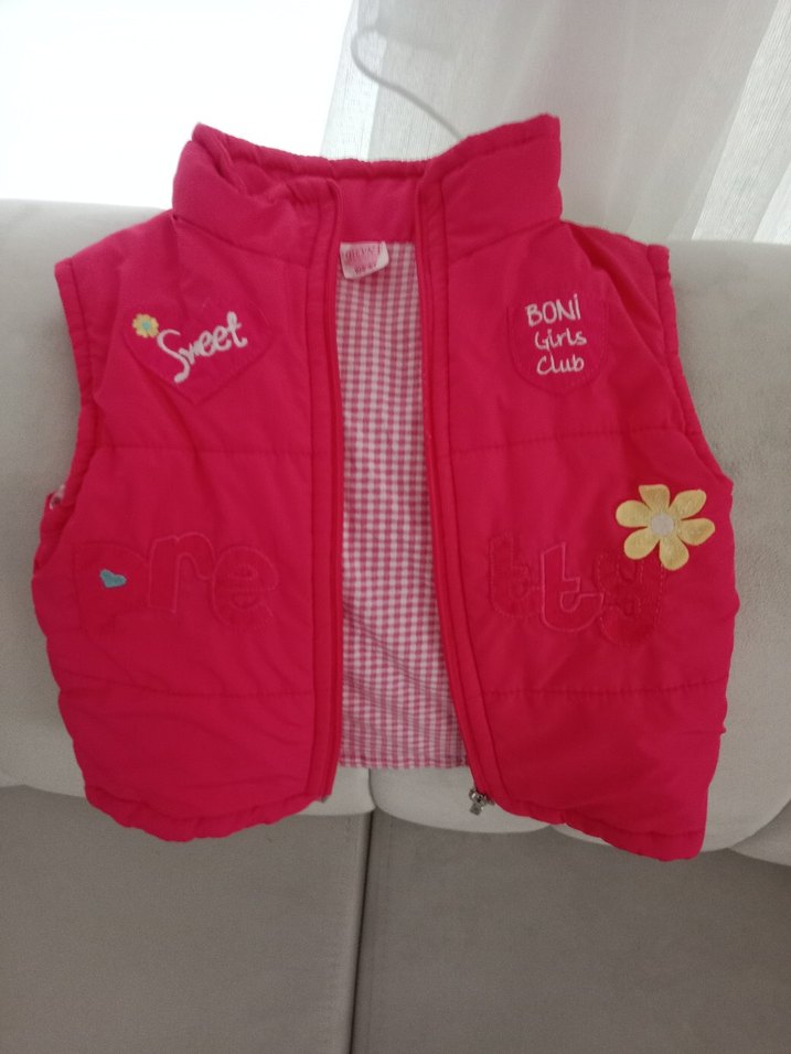 Kızlar için pembe, nakışlı ve fermuarlı, kolsuz, straplez yaka yelek. Yumuşak ve sıcak kumaştan, renkli detaylarla trendy casual tarzına uygun. ☀️