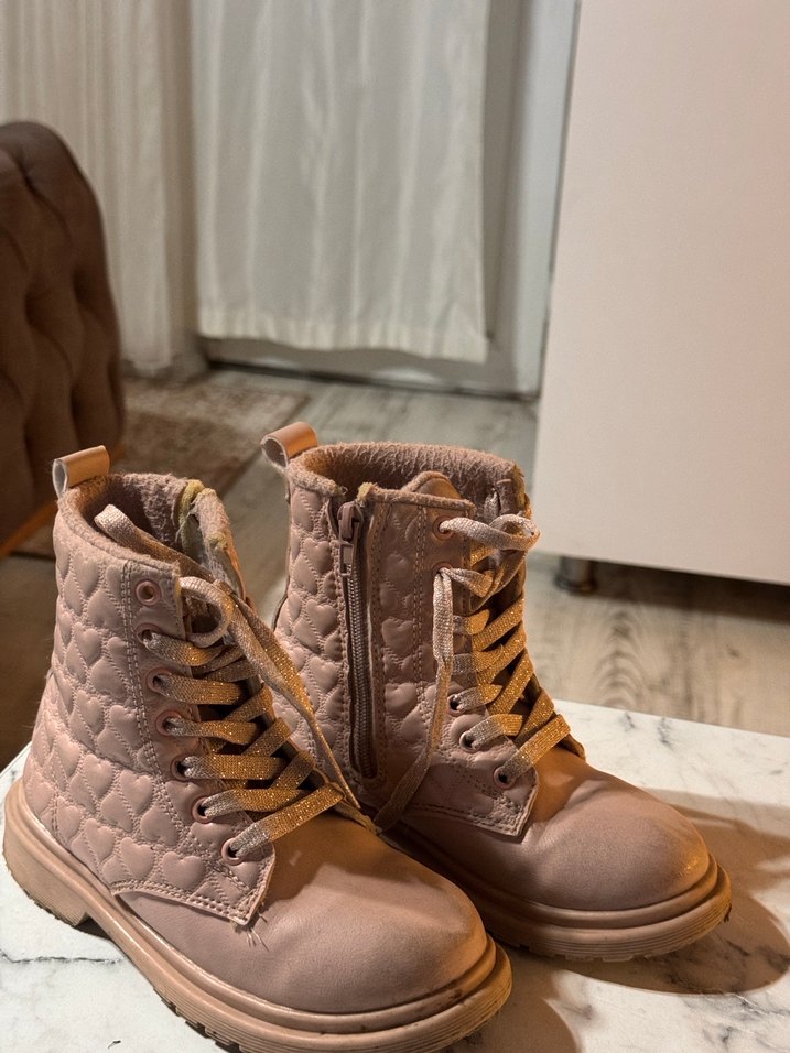 Kızlar için süet malzemeden, nakışlı desenli ve kürk detaylı pudra renk botlar. Bağcıklı ve yan fermuarlı, sokak modasına uygun. Herhangi bir sorun yok tertemiz