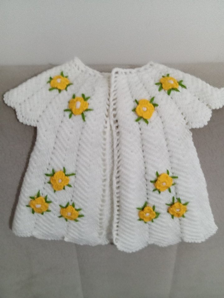 Kısa kollu, bol kesim beyaz örgü kız çocuk hırkası, renkli sarı çiçek nakışlarıyla süslenmiştir. Yumuşak örgü kumaştan ve klasik tarzda.