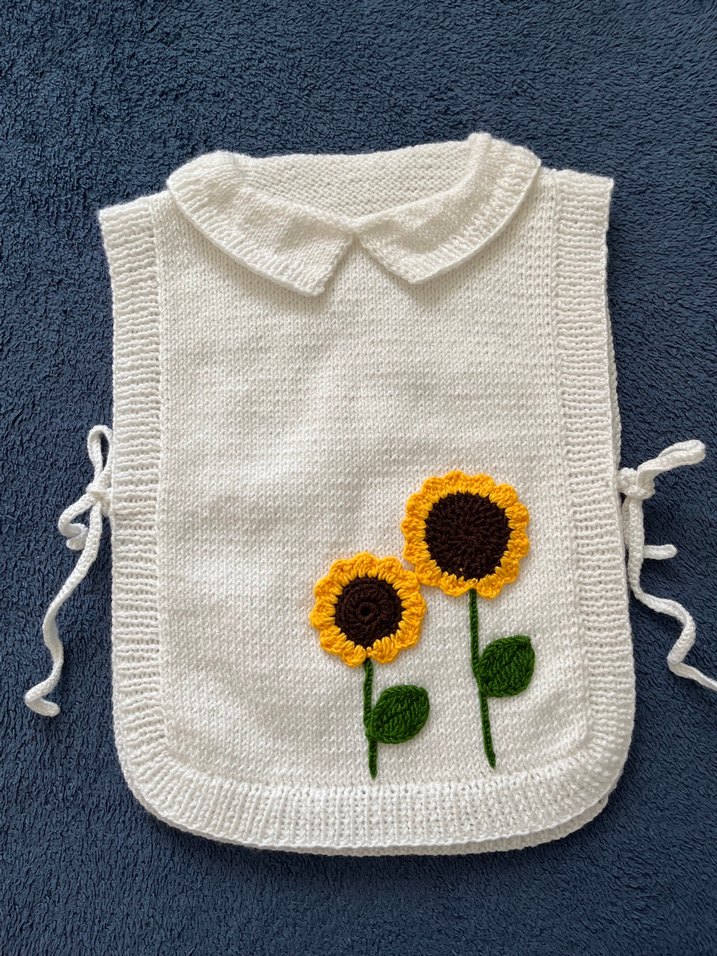 Kolsuz, bol kesim örgü kumaştan yapılmış beyaz hırka. Önünde renkli nakışlı ayçiçeği desenleri ve bohem tarzı yaka bulunur.