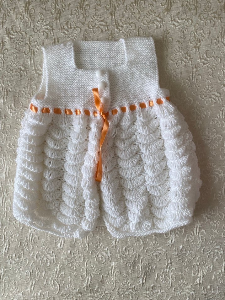 Kızlar için beyaz renkte, nakışlı ve turuncu kurdele detaylı, kolsuz örgü, bohem tarzda fitted hırka.