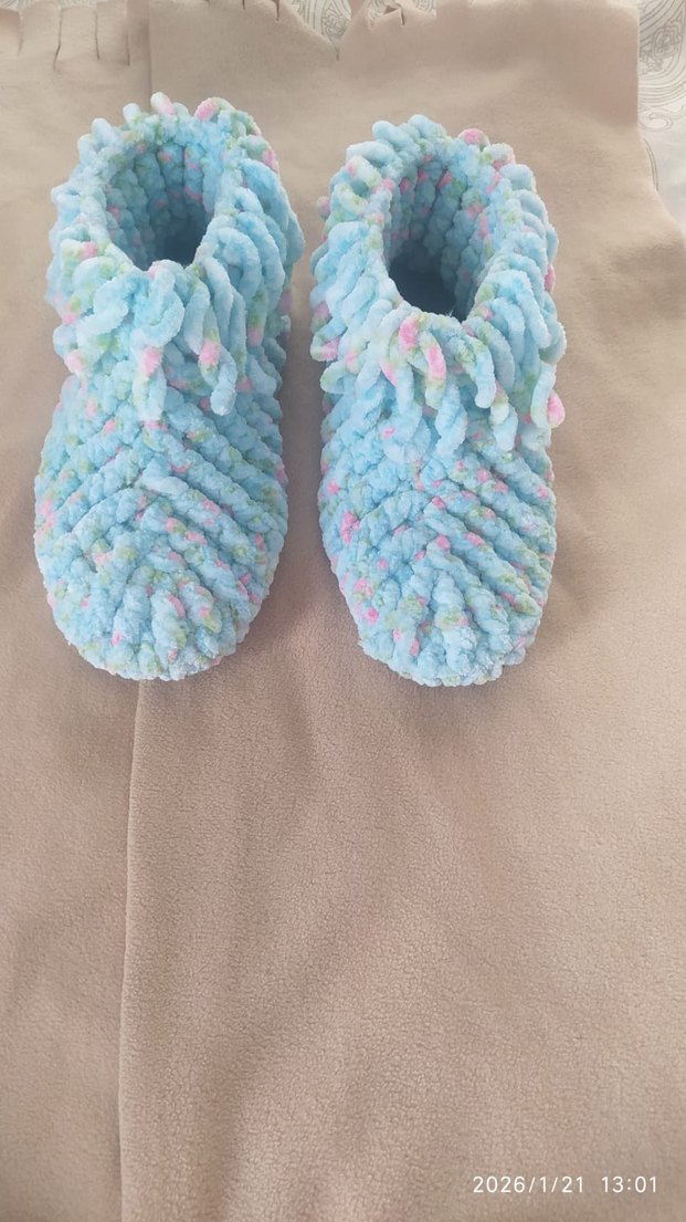 Kızlar için örgü bağcıklı ev terliği, mavi tonlarda pastel batik desenli ve bohem tarzda rahat bir modeldir. ıstenılen renk yapılır