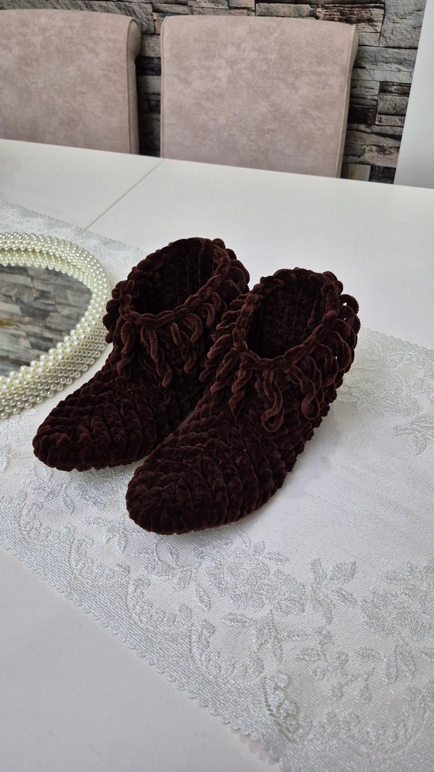 Koyu kahverengi, örgüden üretilmiş kız çocukları için sıcak ve rahat ev terliği, klasik tasarıma sahiptir. bot patik