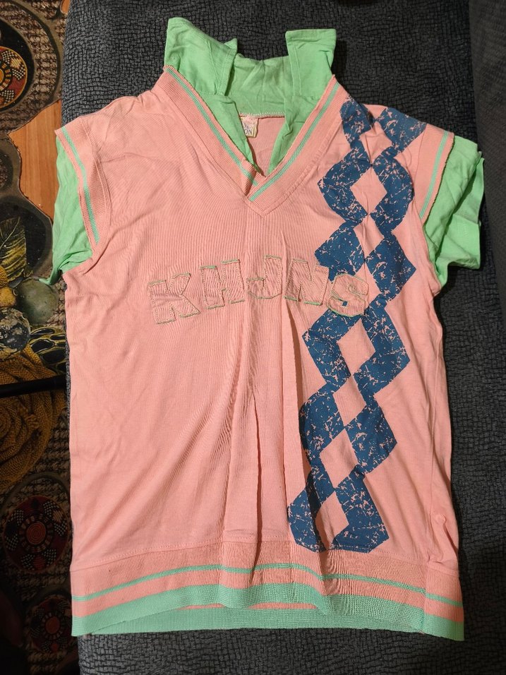 Kısa kollu, straplez, bol kesim kız tişörtü, örgü pastel pembe tekstil ve mavi geometrik desenle tasarlanmıştır. Özgün karşı kültür tarzındadır.