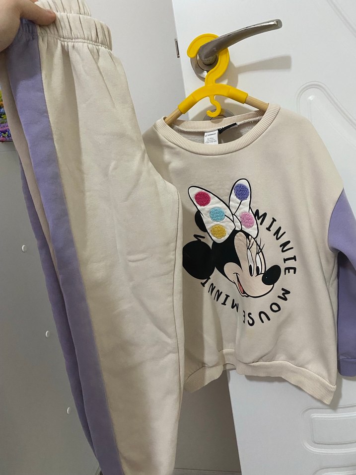 5-6 yaş Pamuk şardonlu, bol kesim ve pastel renklerde kız çocuk eşofman takımı. Uzun kollu, bisiklet yaka üstünde renkli Minnie Mouse baskısı ve punch detaylar bulunur. Rahat ve trend sokak stili.