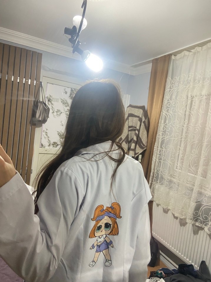 Pamuklu, uzun kollu, yakalı ve düğmeli, bol kesim kız gömleği. Beyaz renkli, sırtında baskılı desenli, bohem ve retro tarzda. Çocuk gelişim bölümüm için aldım hiç giymedim 750 tl ye almıştım