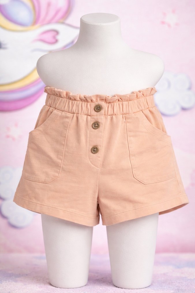 Kızlar için düğmeli ön cep detaylı, bol kesim pamuklu şort. Yumuşak bağlama deseni ile rahat ve şık bir görünüm sunar.