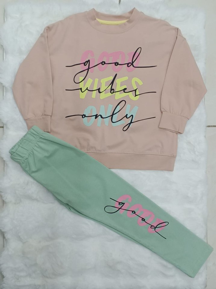 Kızlar için pamuklu, örme, bol kesim sweatshirt ve pastel renkli eşofman altından oluşan takım. Üstte uzun kollu, bisiklet yaka ve renkli "good vibes only" baskısı bulunur.