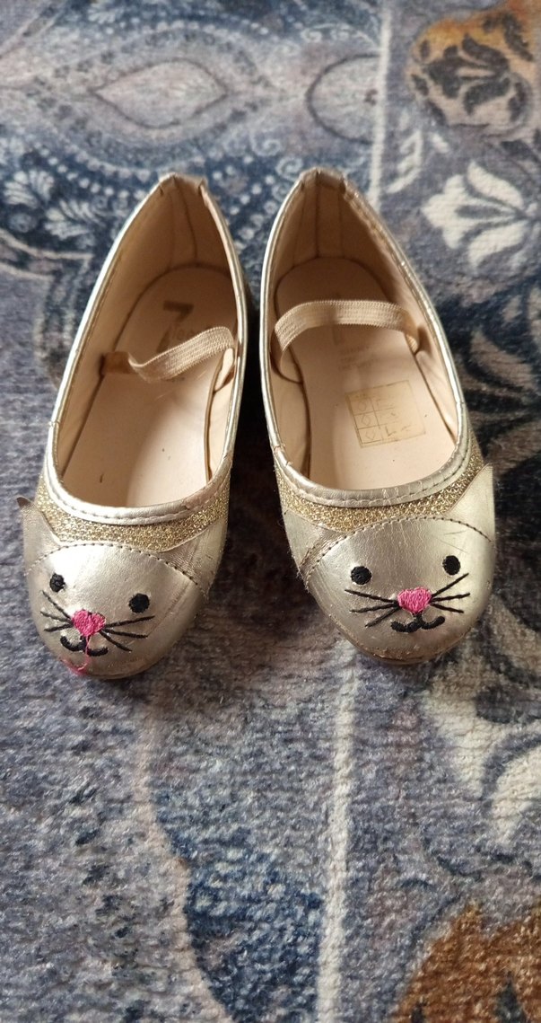 Kızlar için parlak altın renkte, burun kısmında nakışlı kedi yüzü detaylı, lastikli ve tokalı kauçuk babetler.
