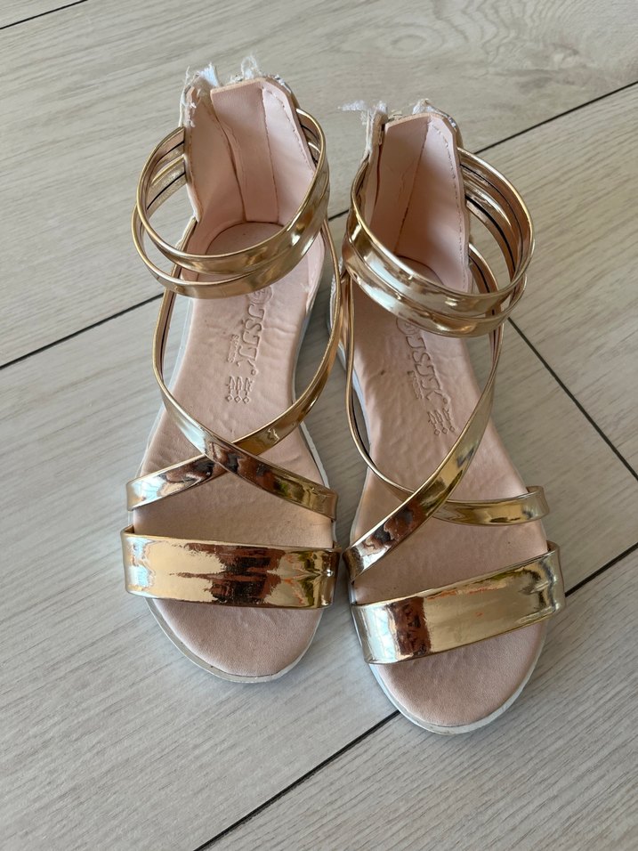 Parlak altın renkte tokalı kayışlara sahip, kauçuk malzemeden yapılmış çağdaş kız terliği. ✨