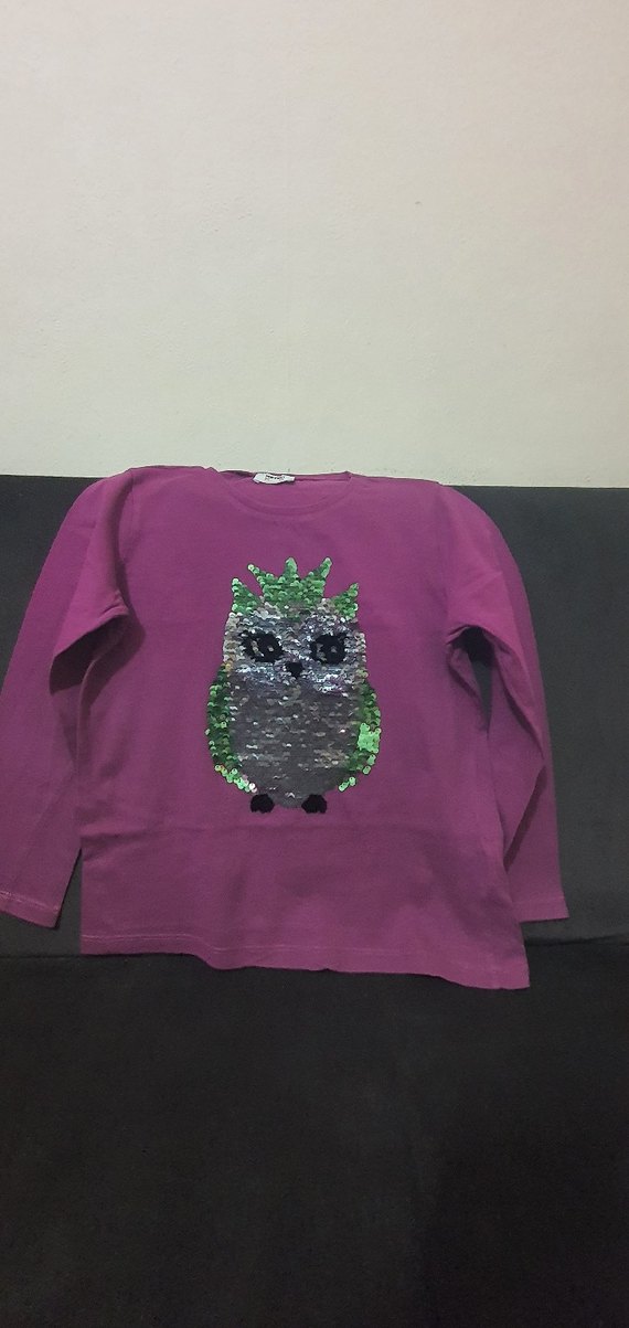 Mor renkli ve pembe renkli 3 adet uzun kollu kız tişörtü, parıltılı renkli baykuş ve unicorn baskısıyla. Pamuklu kumaştan 3 adet fiyatıdır.